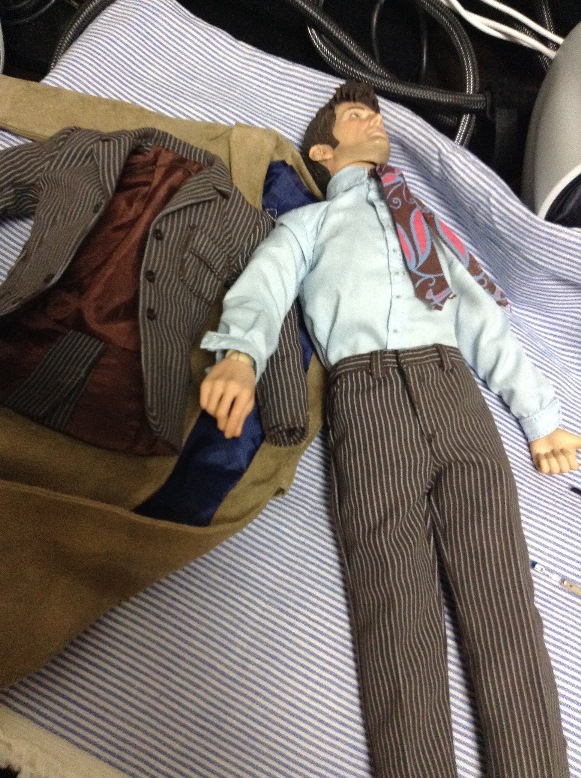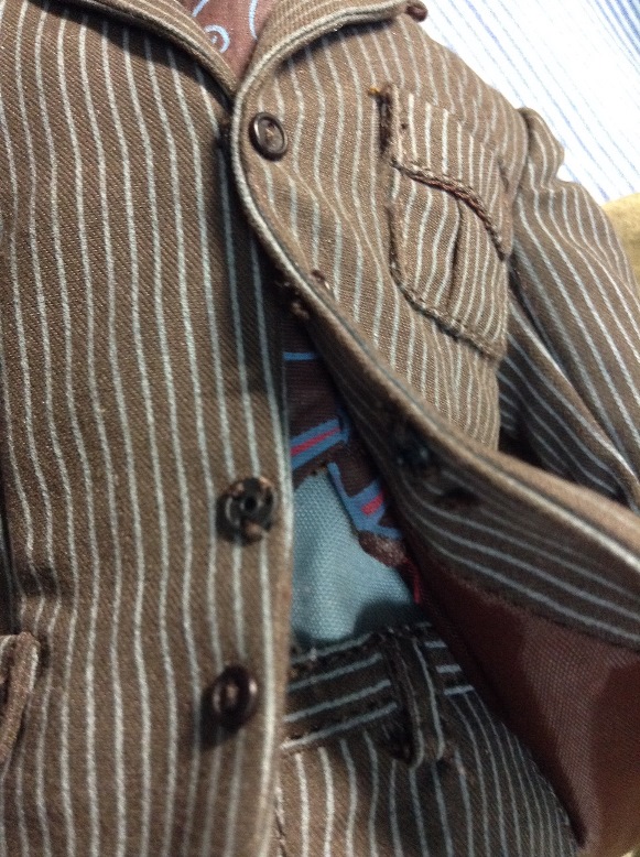 勿論服が小さいので袖を通すのが非常に難しい。そして前述の通りワイシャツが非常にゴワゴワした素材なため、ジャケットを着せても肩に皺が寄りまくり。袖から必死にワイシャツの袖を引っ張るも中々上手くいかない。
